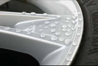 Hier sehen Sie eine von uns versiegelte Alufelge. Nachdem die Felge repariert und lackiert wurde, haben wir zum Schluss eine Versiegelung aufgetragen.Auf diesem Bild sehen Sie dann den Abperleffekt wenn Wasser auf eine versiegelte Felge kommt.